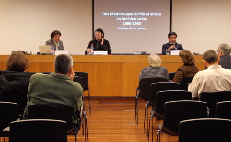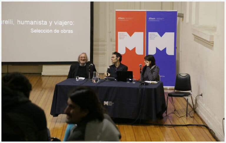 Conversatorio en el Salón Blanco del MNBA, con la participación de Francisco Brugnoli, Gloria Cortés y Christian Leyssen.